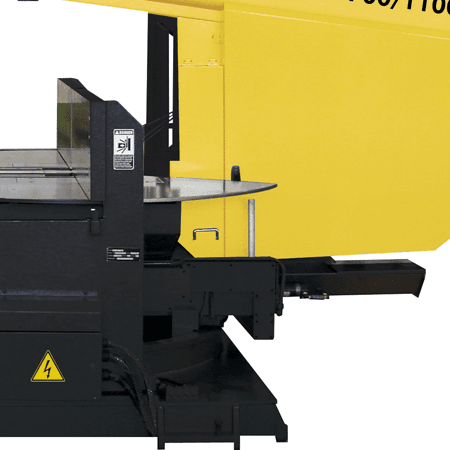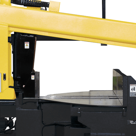 Very heavy construction swing head bandsaw with twin column design for production cutting of large heavy sections.