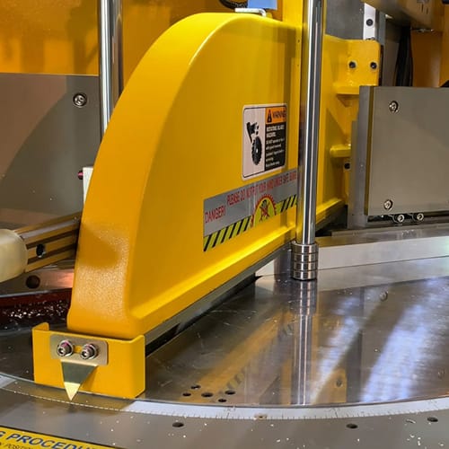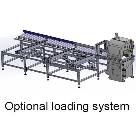 Highly productive cutting cell comprising of large 500 mm blade semi-Automatic mitre saw with NC powered head rotation and servo driven material pushing system. The standard machine is manually loaded, there is an option for automatic material loading. The pushing and loading elements are available in customer definable operational lengths, standard is 6500 mm. There are many options for the unloading side from simple roller table to robotic transfer.
