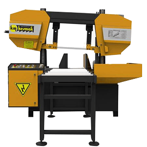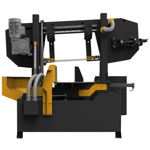 Semi-automatic twin column band saw with linear guide design, one way easy-mitre (swivel head) ideal for general fabrication applications where simplicity of operation, precision and reliability are key factors.