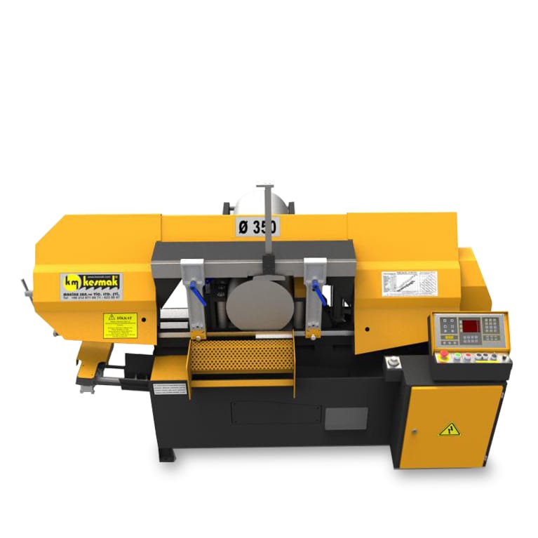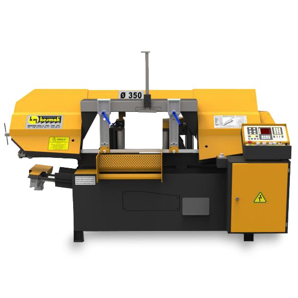 This machine tool has a capacity of 350mm for round and square material cut at 45 degrees.