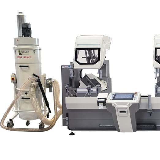 Double mitre saw with pneumatic positioned outward tilting heads with a range of 90°, 45° or 22,5° and mechanical stops for intermediate angles. The large sector plate ensures the most accurate setting of angles, with default positions at 90° and 45°. The NEW touch screen PLC control system with 7″ graphical display and USB data storage is simple to use for either quick processing of random cuts, or from pre-programmed cutting lists*. The control system has the ability to receive cutting lists from compatible external software via the USB, and print labels containing job data or bar codes for integration with CNC machining centres.