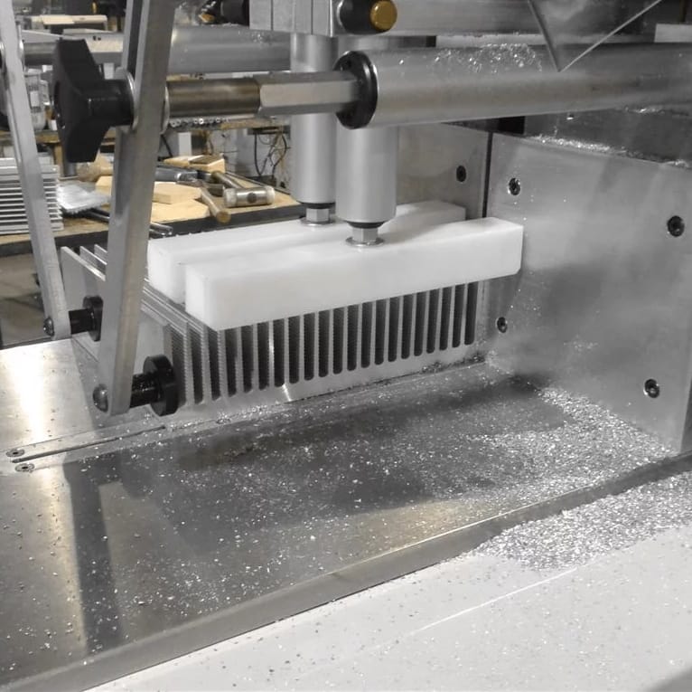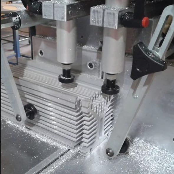 Automatic mitre cutting-off machine for 90 degree cutting of large aluminium profiles, with a Ø600 TCT rising saw blade controlled by a manual double button press to increase operator safety.