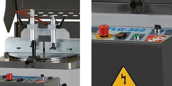 Manual action mitre saw with pneumatic vertical vices (option for horizontal) and mist spray blade lubrication. Easy turn cutting table with left/right mitre cutting through 180 degrees and a back fence that is adjustable to increase the width capacity.
